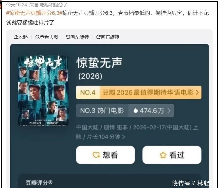 不少蓝本锁定《惊蛰无声》的不雅众,在看到豆瓣6.3分后就地退票改组,坦言:“过年图个乐呵,谁想进影院还憋着连气儿?”