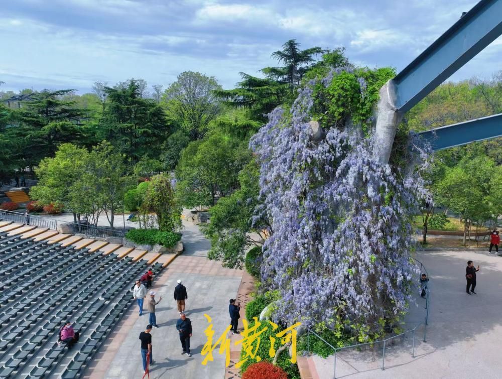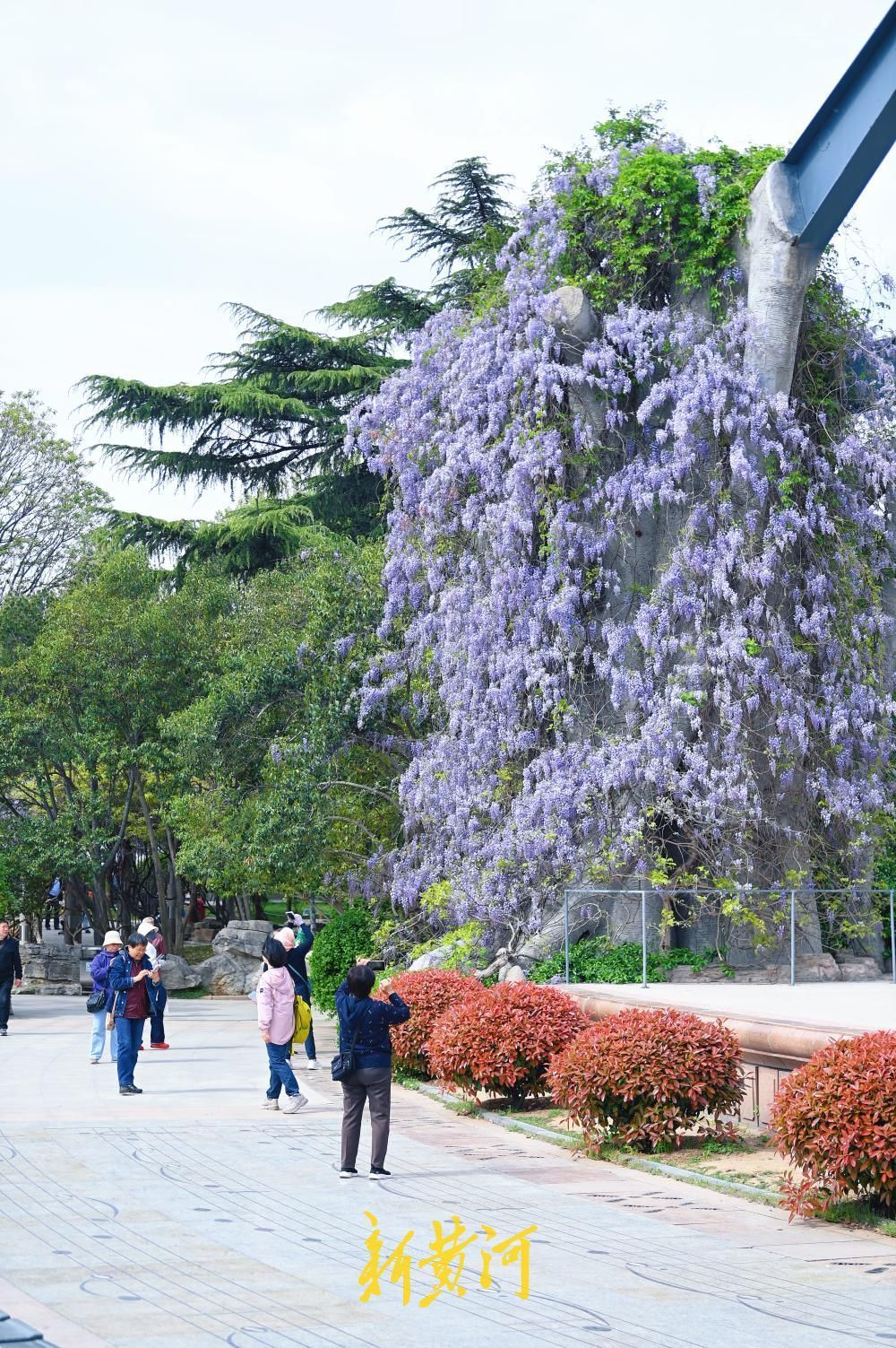 4月8日,泉城公园里的紫藤花开正艳,一簇簇当然垂下的紫藤如瀑布,开得灿烂满怀。