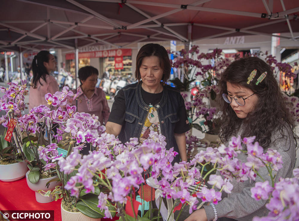 ↑2026年2月6日,主顾在海南省琼海市嘉积镇年货节市集上选购鲜花。CICPHOTO/蒙钟德 摄